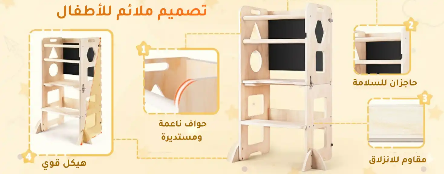 【متينة وآمنة】يقلل التصميم المتين على شكل حرف “A” من فرصة الانقلاب. الحواف مصقولة بعناية ودائرية لتجنب الإصابات. شريط أمان إضافي قابل للإزالة يضمن ثبات طفلك وأمانه أثناء استخدام البرج.