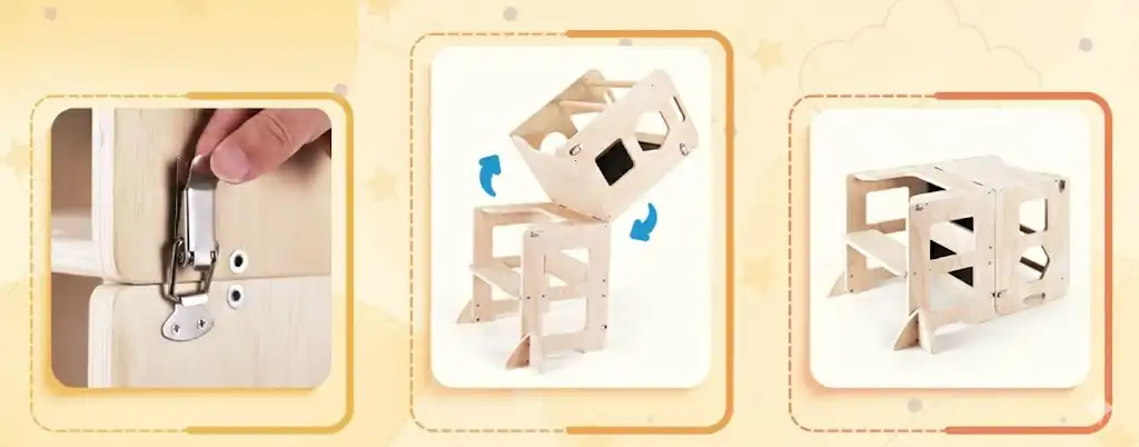 【مجموعة طاولة وكرسي للأطفال】مع آلية مشبك بسيطة، يمكن تحويل هذا البرج بسرعة إلى مجموعة طاولة وكرسي. مصممة للتكيف مع احتياجات طفلك المتطورة، مما يجعلها منطقة تعليمية متعددة الاستخدامات.